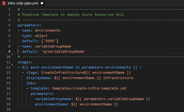 Pipelines are the outermost layer and are unique to each project. They contain things like variable group names and environment names that you are concerned with. Here’s an example:
