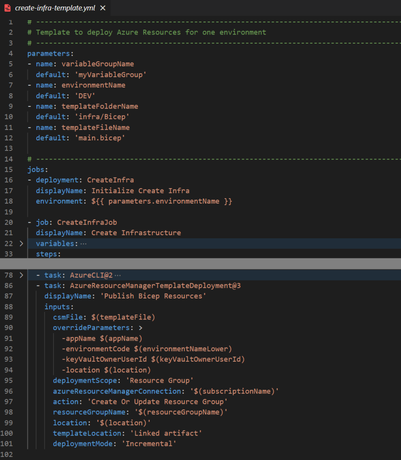 The template layer is where the real work gets accomplished. In this example, a main.bicep file is deployed to Azure using variables found in the variableGroup passed in the parameters and the current environment from the parent pipe step to build those resources with unique names. (Intermediate steps hidden in lines 34-77 provide some debugging information, which is quite useful when setting these up for the first time.)