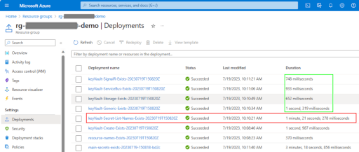 The only real drawback of this version is that it adds an addition ~90 seconds to the pipeline run time to go fetch the list of secret names currently in the vault. (Again, the script runs in a few seconds but it takes well over a minute for the pipeline to set up the PowerShell environment.) Each of the secret existence checks after that take less than 1 second, as shown in this deployment summary: