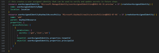 One important note in this solution is that the Bicep template needs security rights to read the key vault. This was accomplished by creating a Managed Identity in the Key Vault. When the Key Vault is created, a managed identity is assigned. Note: if you are only doing version 3, then you should remove the “Set” and “Get” secrets permissions below, as it only needs list permission, but if you are trying version 2, then you’ll want to be able to get and set the values also.