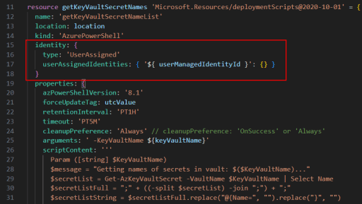 When a Bicep template PowerShell Script needs access to the Key Vault, it uses the Managed Identity context to read the secrets: