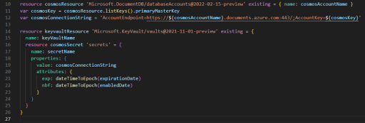 The next logical step on this journey is to create a custom Bicep template that determines the secret for a resource and then adds it to a Key Vault all in the same module, eliminating the secret leaks, something like this: