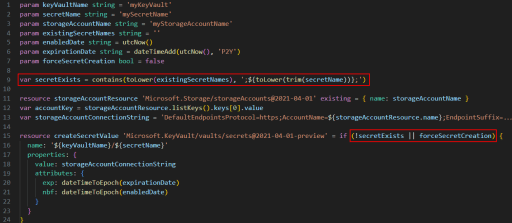 In the Bicep file that creates the key, it’s now trivial to pass in the list of existing secret names and do a quick compare to see if your key exists in the Key Vault, then skip the step if it already exists with a conditional statement: